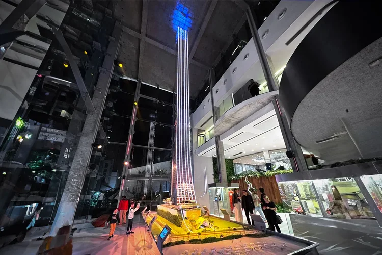 A réplica ocupa quatro andares de um edifício no centro da cidade. São 90 toneladas de aço e vidro, com projeções em LED, ambientação sonora e cenários que explicam o conceito do projeto. A maquete virou um espaço interativo para apresentar a torre como se já estivesse pronta — incluindo elevador simulado e rooftop fake. A inspiração da torre vem de Ayrton Senna. O prédio leva o nome do piloto e foi concebido como uma metáfora para sua trajetória. A artista plástica Lalalli Senna, sobrinha do tricampeão, assina o conceito visual. “A curva da torre simboliza a jornada de superação do Ayrton. A estrutura no topo representa a transição da matéria para a luz”, diz.